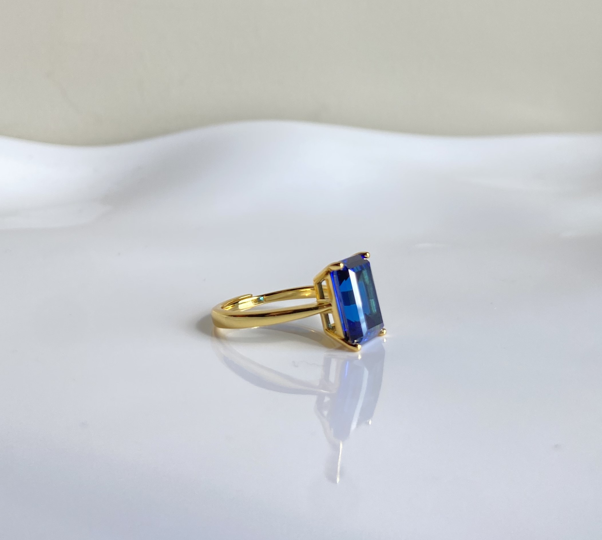 Anello Andromeda REGOLABILE in argento 925 placcato in oro con Quarzo Blu notte Centrale taglio rettangolare