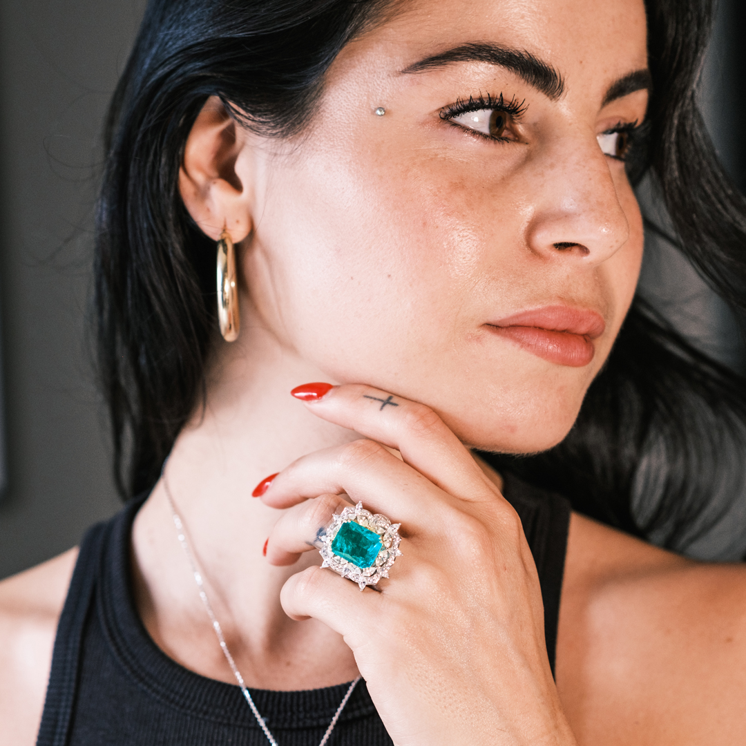 Un capolavoro di luminosità e prestigio. Questo anello a misura è realizzato in argento 925 rodiato e impreziosito da un quarzo verde paraiba centrale di grande impatto visivo, incorniciato da quarzi bianchi taglio navette finemente incastonati lungo tutta la montatura.