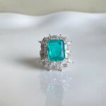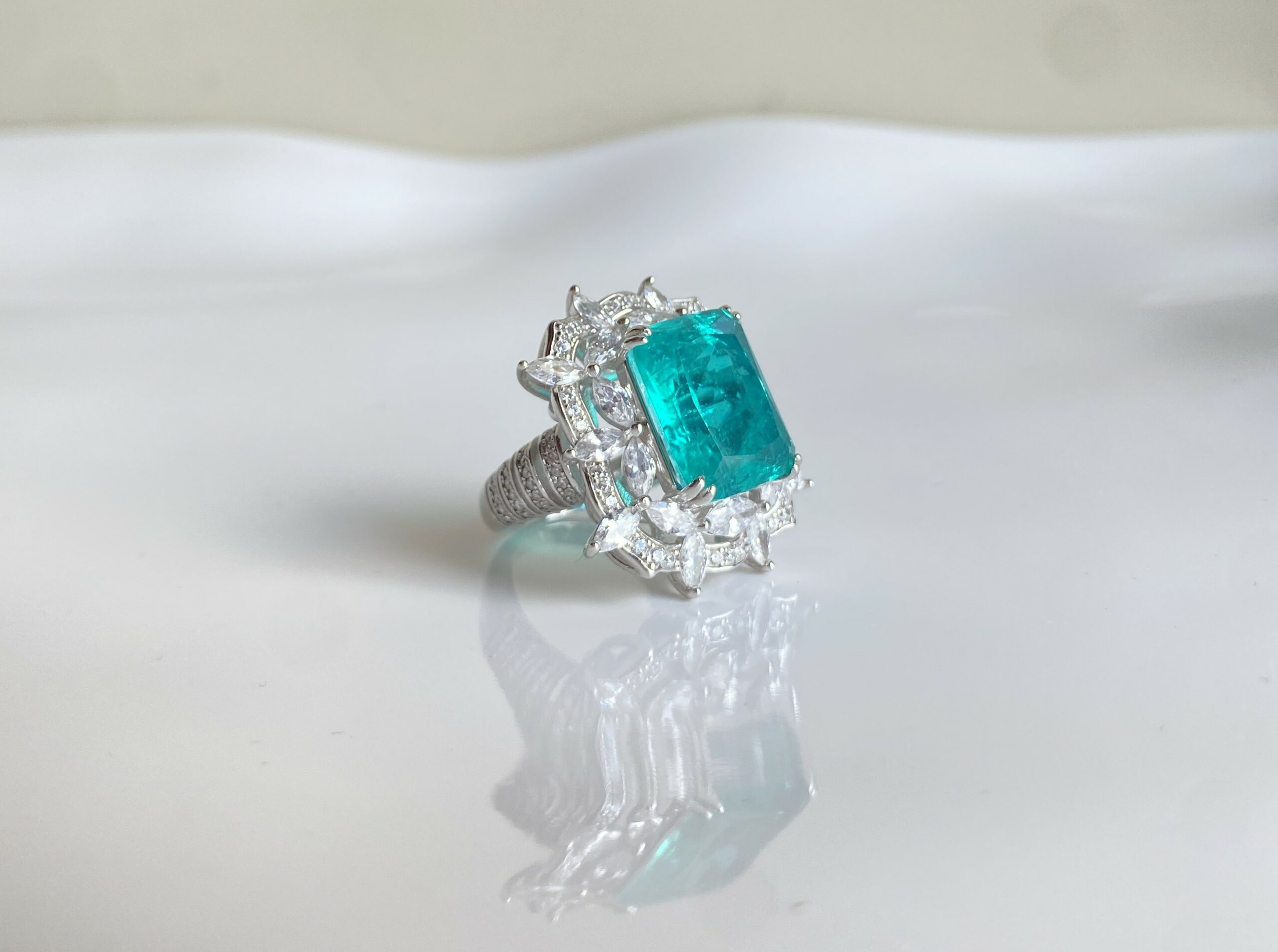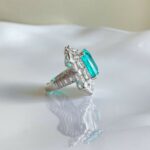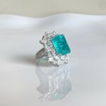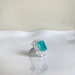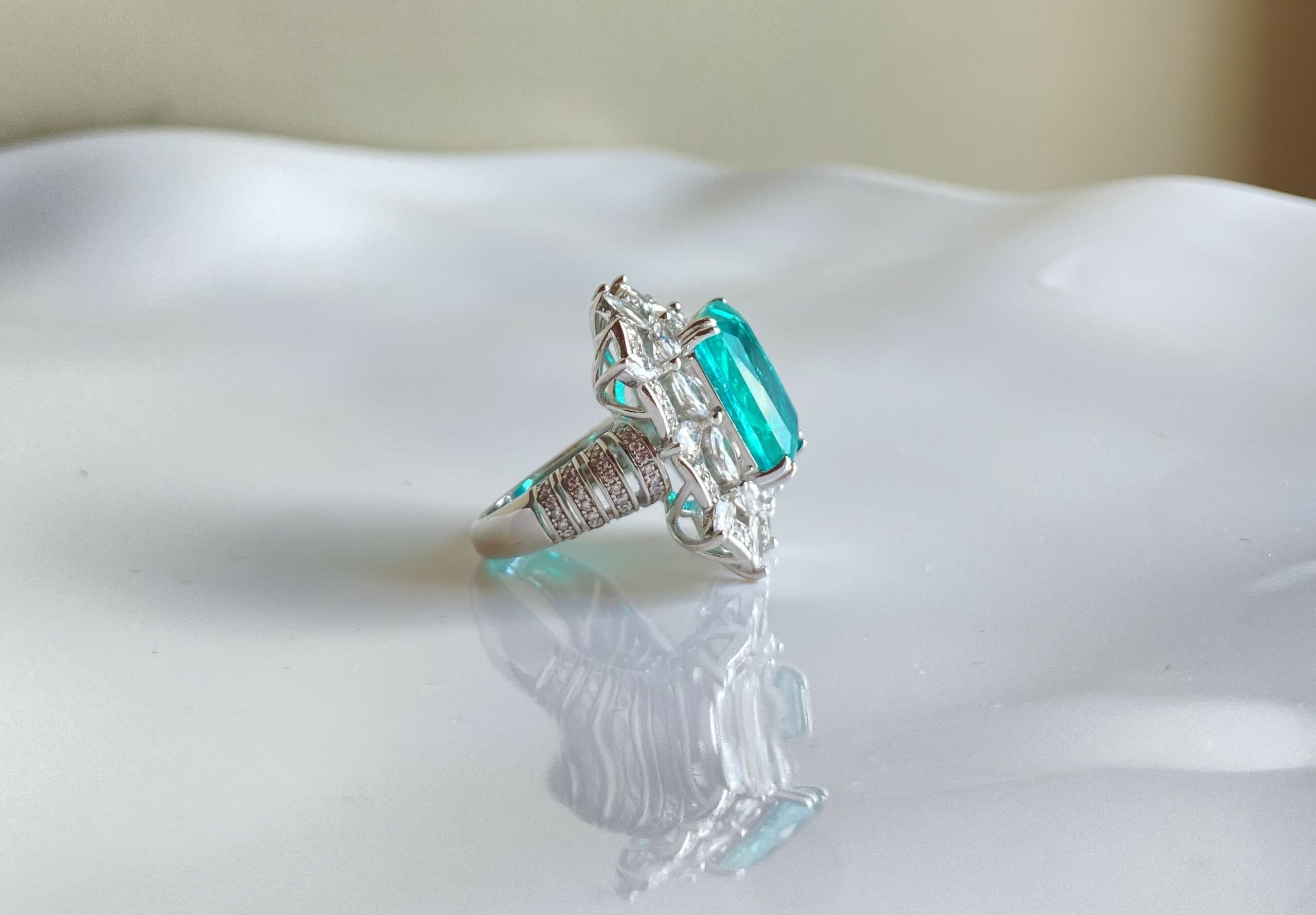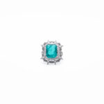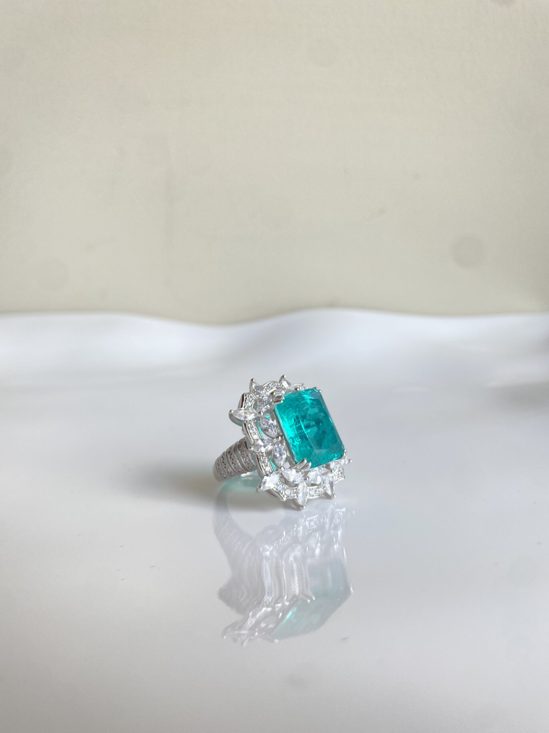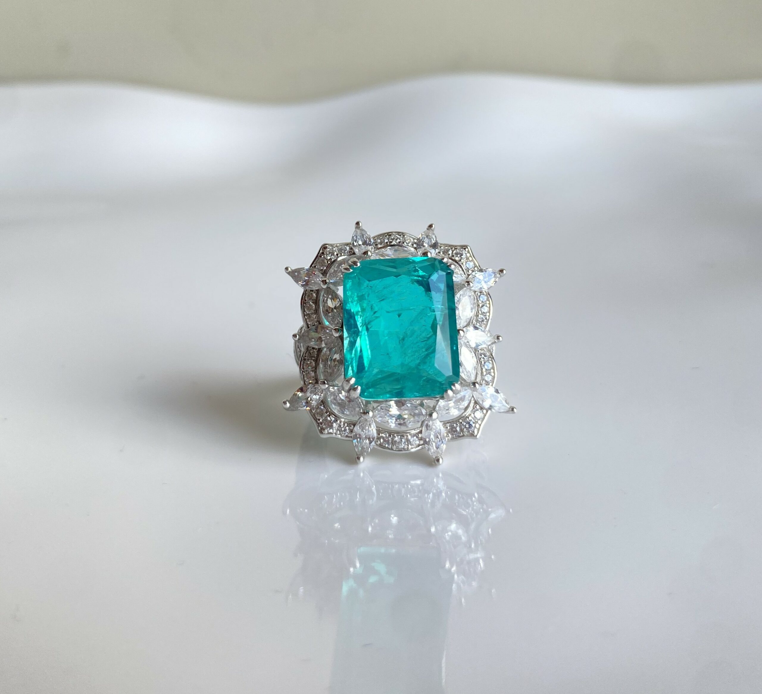 Anello a misura in argento 925 con quarzo centrale verde paraiba e contorno di quarzi bianchi incastonati. Eleganza raffinata e luminosa.
