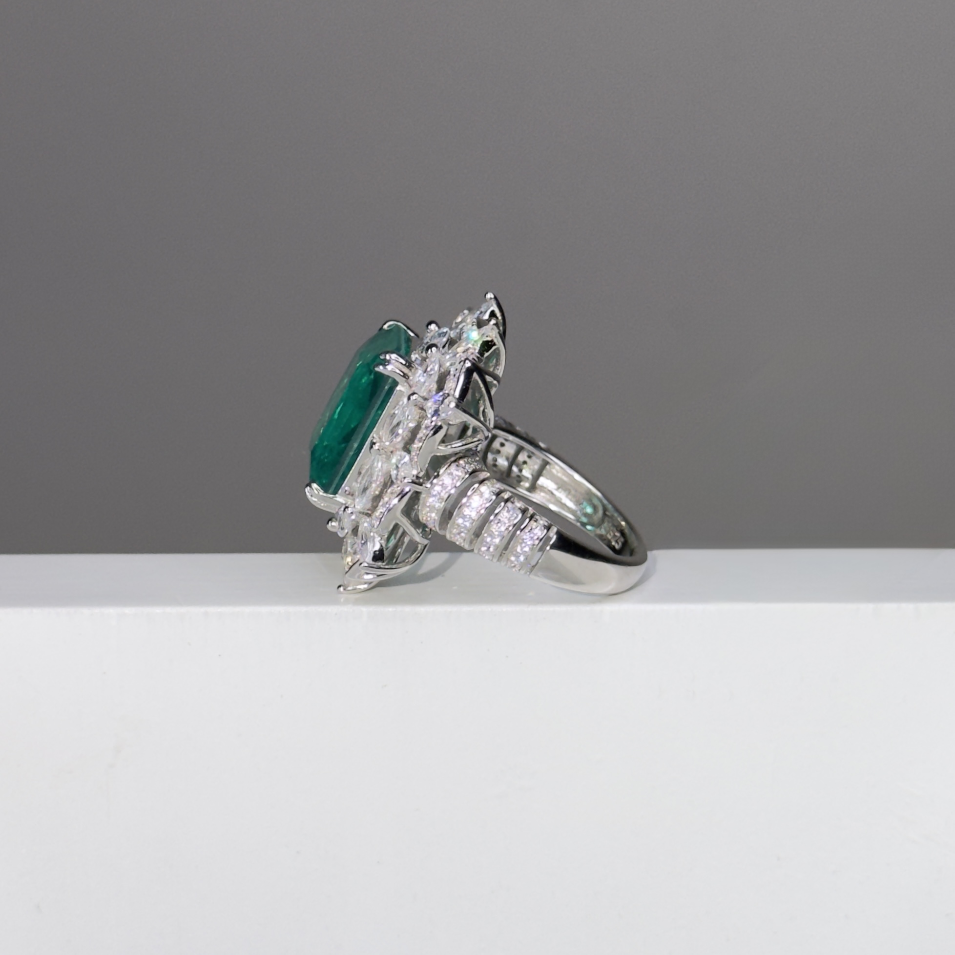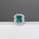 In Argento 925 doppia rodiatura impreziosito da un Quarzo centrale verde Paraiba di grande impatto visivo, contornato da Quarzi bianchi taglio navette, emblema di una grande e minuziosa lavorazione artigianale.