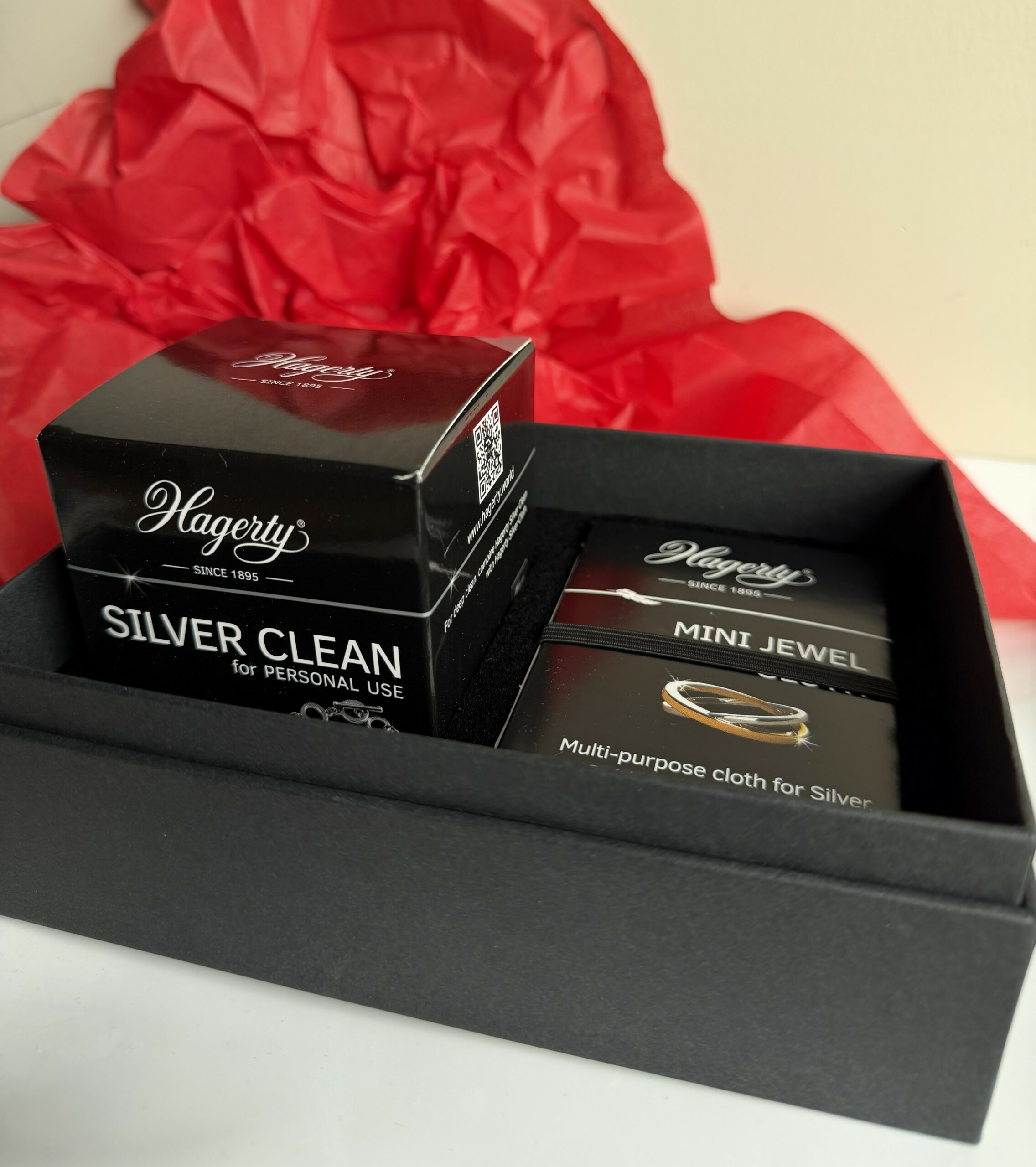 Contiene 1 pz panno lucidante, 1 pz soluzione Silver Clean con cestello per detergere e ravvivare i tuoi gioielli comodamente da casa.